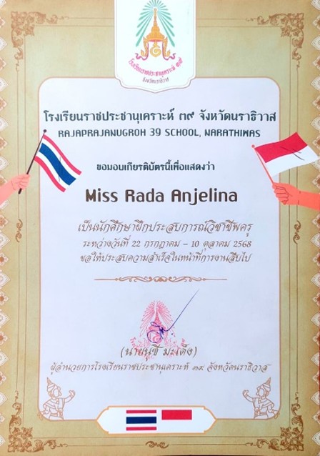 Thailand – Rada Anjelina lahir di Tembilahan pada 22 Januari 2003. Ia dikenal sebagai mahasiswi yang aktif berkegiatan sosial. Sehingga pengalaman yang ia dapatkan mampu menghantarkannya ke dunia internasional. Ia merupakan mahasiswi Pendidikan Islam Anak Usia Dini (PIAUD), Universitas Islam Negeri Sultan Syarif Kasim (UIN Suska) Riau, yang berhasil menorehkan prestasi membanggakan melalui pelaksanaan Kuliah Kerja Nyata (KKN) dan Pengenalan Lapangan Persekolahan (PLP) Internasional 2025 di Rajaprajanugroh 39 School, Thailand.