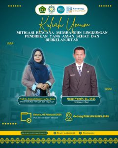 Selasa, 03 Februari 2026 di gedung pusat kegiatan mahasiswa, Fakultas Tarbiyah dan Keguruan UIN Suska Riau melaksanakan kuliah umum semester genap. Kuliah umum di buka oleh wakil rektor 1 bapak Prof. H. Raihani, M. Ed., Ph.D dan selanjutnya juga ada kata sambutan dari Dekan Fakultas Tarbiyah dan Keguruan, ibunda Prof. Dr. Amirah Diniaty, M. Pd., Kons. Dalam kuliah umum diikuti oleh mahasiwa semester 2, para dosen dan tendik Fakultas Tarbiyah dan Keguruan. Kuliah umum ini mengangkat tema “Mitigasi Bencana: Membangun Lingkungan Pendidikan yang Aman, Sehat dan Bekelanjutan”.