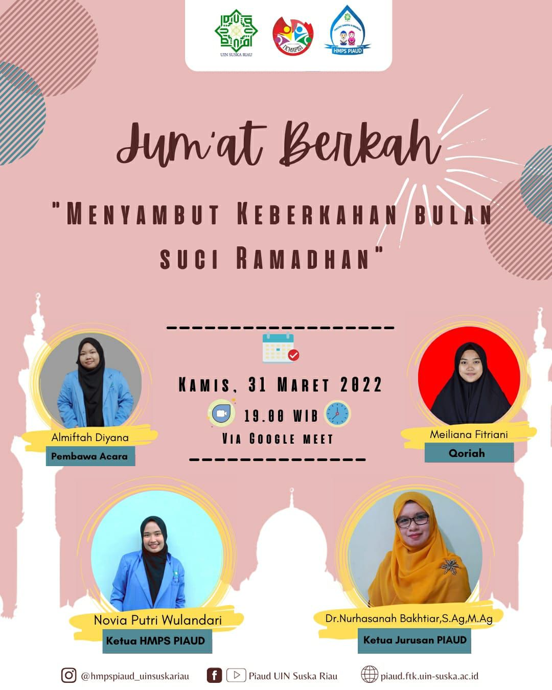 Tarhib Ramadan adalah tradisi umat islam dalam menyambut bulan suci ramadhan. Menauladani Sahabat pada zaman Rasulullah SAW yang sudah meninggalkan kegiatan duniawi beberapa bulan sebelum memasuki bulan ramadhan, keluarga besar PIAUD UIN Suska Riau juga bersuka cita menyambut bulan suci ramadhan dengan persiapan kegiatan-kegiatan positif. Tarhib Ramadhan diadakan pada Kamis malam Jum’at, 31 Maret 2022...Read More