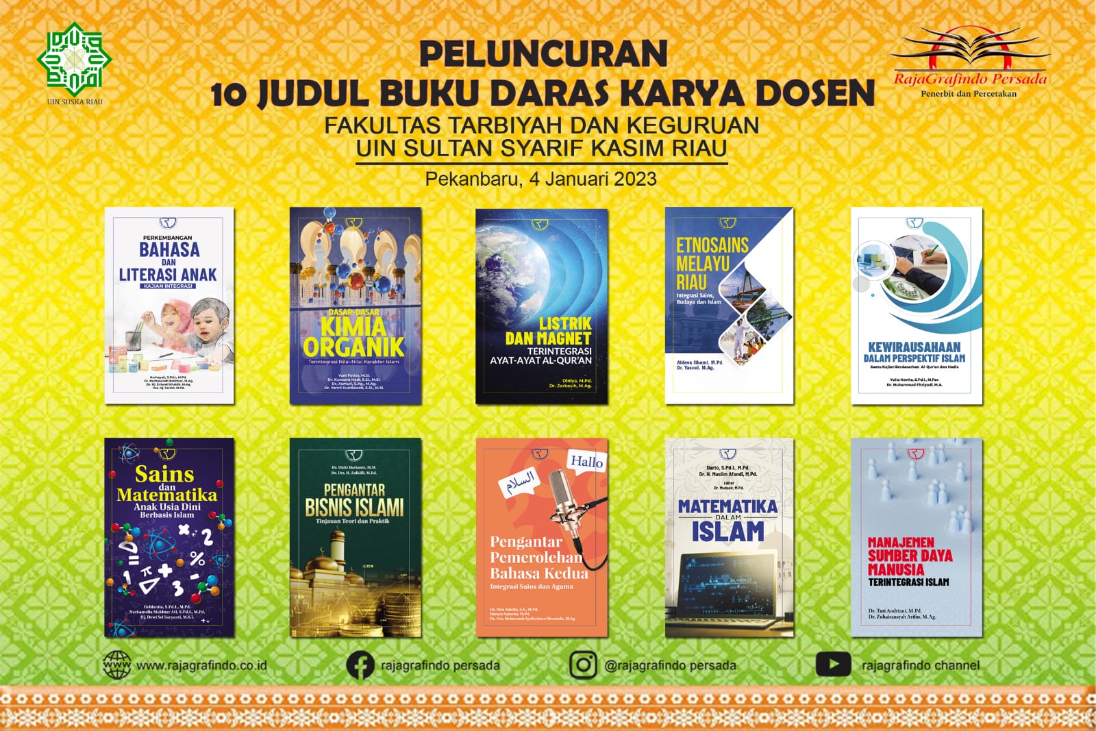 Rabu (4/1/2023), dilaksanakan peluncuran buku Daras karya dosen-dosen Fakultas Tarbiyah dan Keguruan UIN Suska Riau. Dua buku diantaranya adalah karya dosen dosen Prodi PIAUD. Dua buku yang diterbitkan terintegrasi dengan nilai-nilai keislaman sejalan dengan profil lulusan dari prodi PIAUD yakni mencetak pendidik yang bisa mengintegrasikan pengetahuan dengan Islam nantinya ketika sudah menjadi guru Raudhatul Athfal....Read More