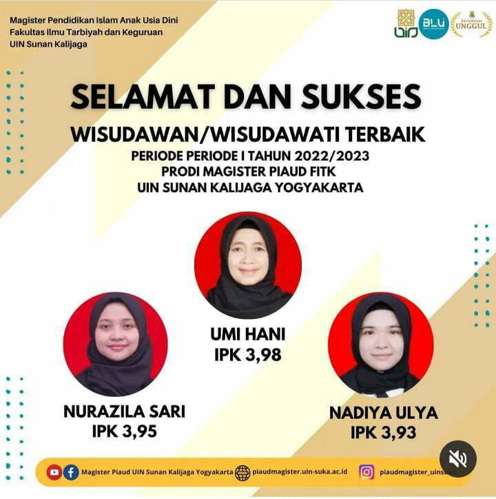 Selasa (1/11/2022), Berita baik datang dari seberang pulau tepatnya Daera Istimewa Yogyakarta (DIY). Nurazila Sari yang merupakan alumni terbaik PIAUD UIN Suska Riau resmi meraih gelar keduanya yakni Master Pendidikan (M.Pd) di UIN Sunan Kalijaga Yogyakarta. Nurazila meraih IPK 3.93 dengan predikat Cumlaude dan menjadi 3 wisudawan terbaik di Prodinya. Tahniah ila, gadis mungil penuh...Read More